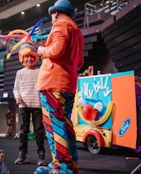Silly Billy delights audiences while working from his quirky Ford Clown Car, adding an extra layer of fun and whimsy to every interaction.